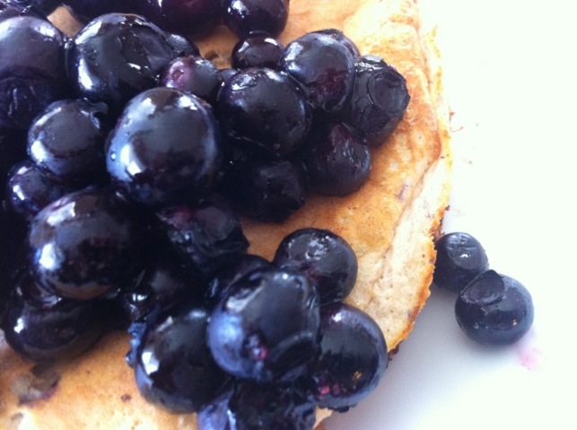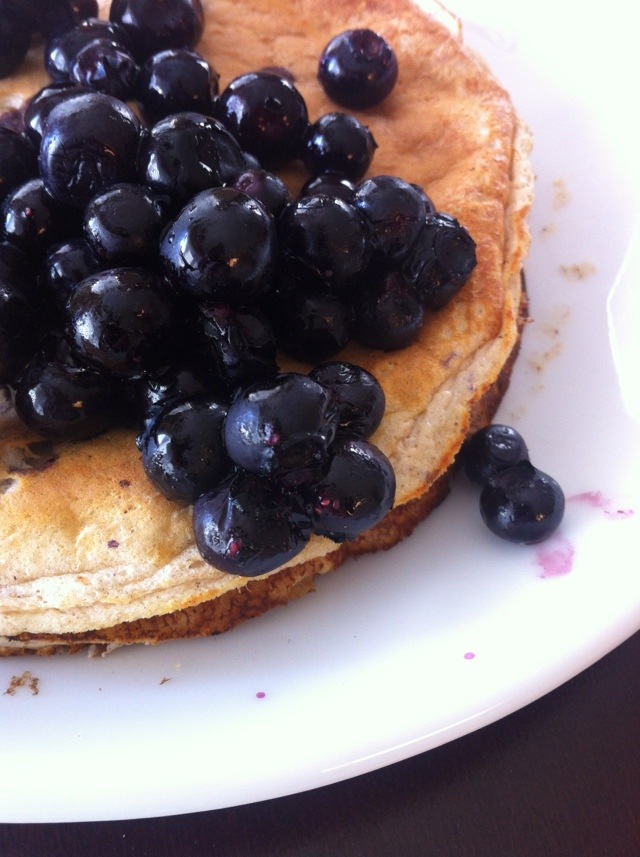 2. Cook on a lightly greased skillet for 2 mins per side. Top with blueberries, maple syrup, banana… Whatever you like! Makes 2 pancakes.