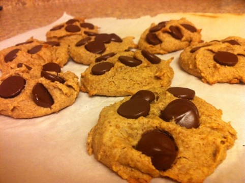 3. Drop cookie batter onto a cookie sheet lined with parchment paper by the spoonful. Stick some chocolate chips in ’em.