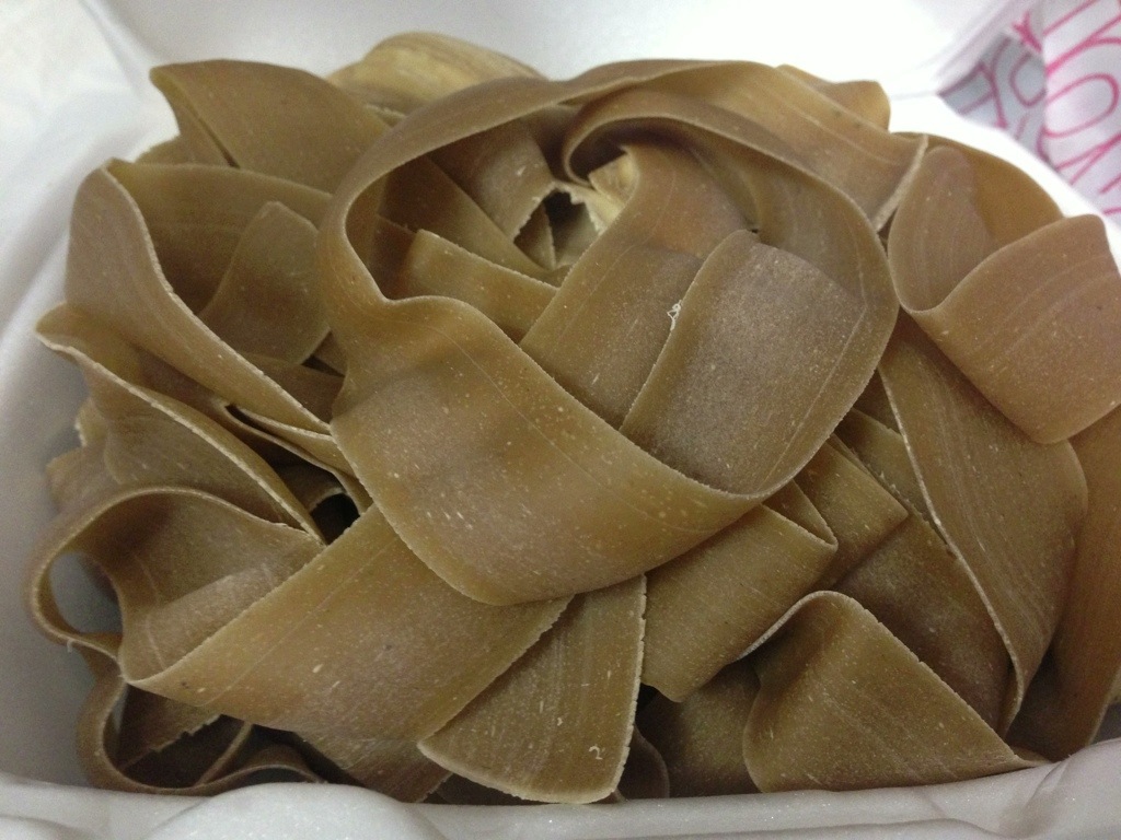 Las Vegas farmer’s markets have a limited selection of fresh foods this time of year. You may have seen my purple cauliflower post recently, and I got some really good strawberries there too. Another great find at the farmer’s market was fresh porcini mushroom pasta. It was made the morning I bought it using ground up dried porcinis and semolina. So good!