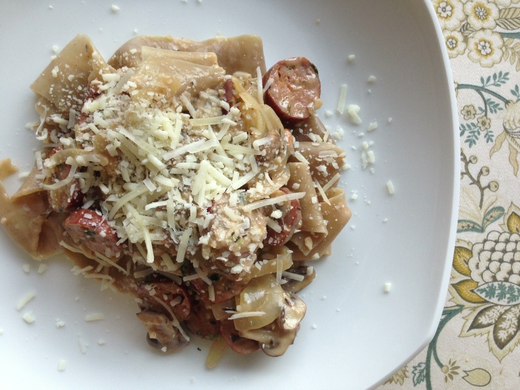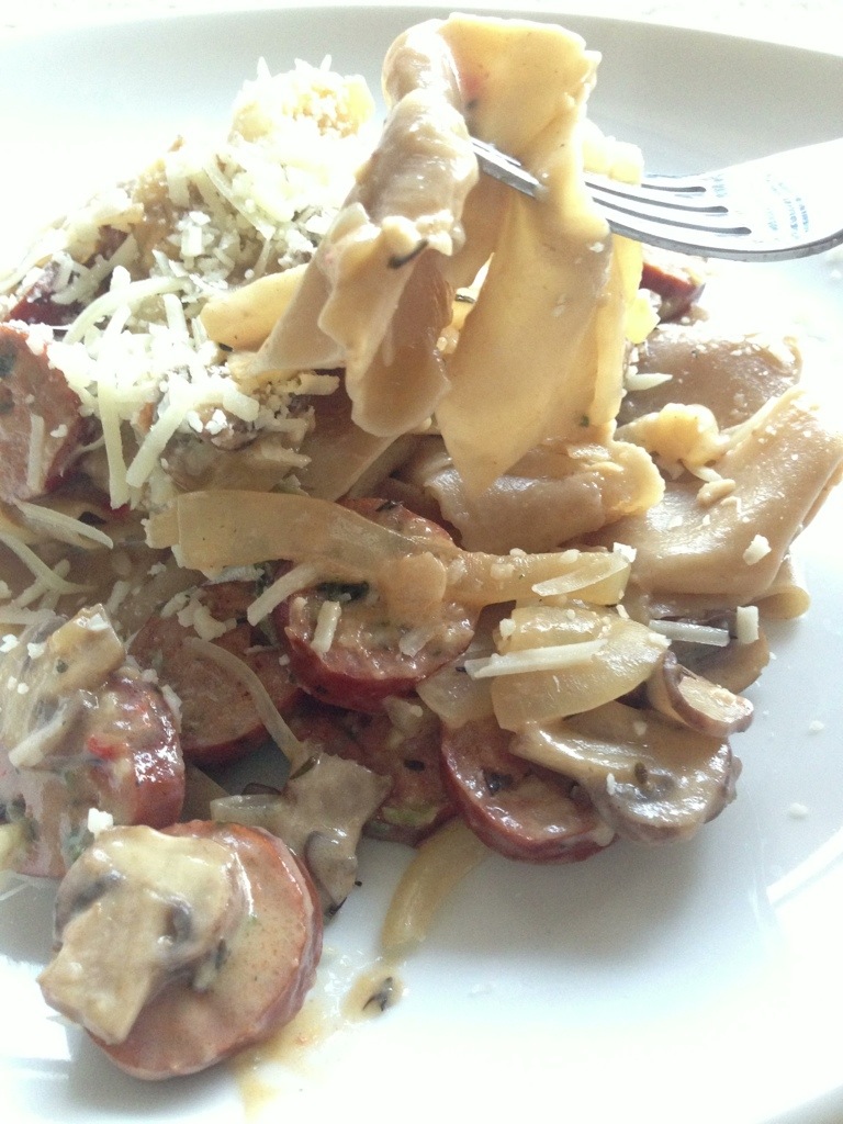 1. Sauté the onion and diced chicken sausage in olive oil. Once the onion is translucent, add garlic, mushrooms, and a splash of white wine.