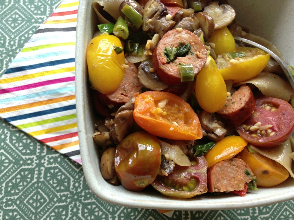 1. Melt the butter in a skillet. Add the mushrooms, garlic, tomatoes, and sausage. Sauté until the mushrooms are beginning to soften and sausage is getting golden.
