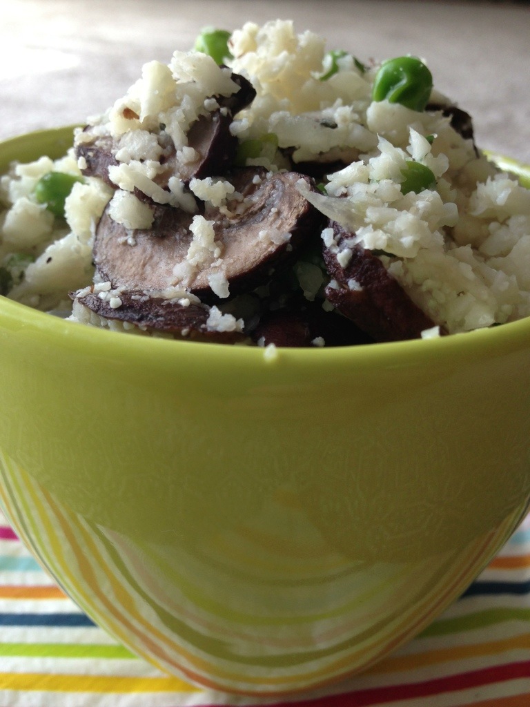 I’ve used cauliflower as pizza crust and as mashed potatoes in shepherd’s pie, but I hadn’t tried “ricing” my cauliflower until yesterday. I’m happy with the result. Here’s a recipe for cauliflower risotto with fragrant roasted mushrooms, white wine, thyme, and peas!
