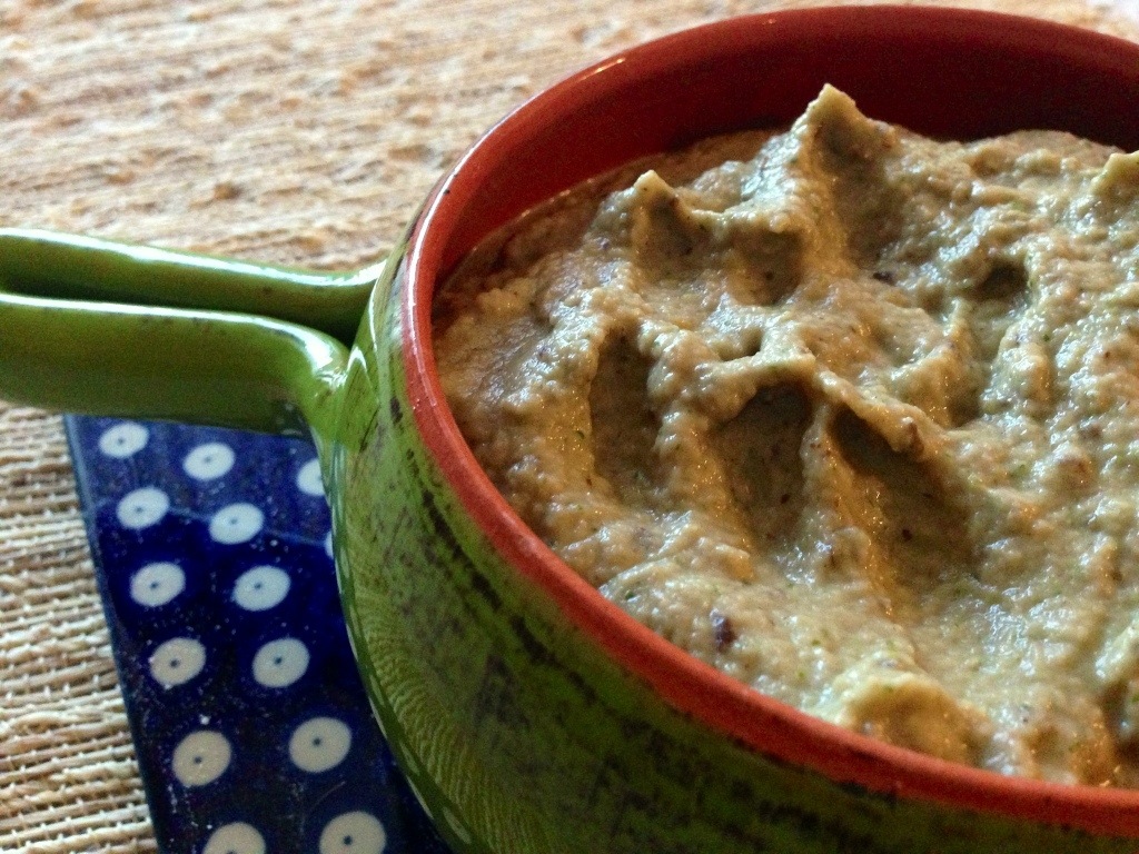 2. Slice the eggplant in half lengthwise and allow to cool. Scoop out the insides and purée in a food processor with all remaining ingredients.
