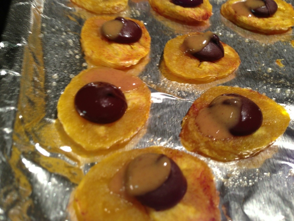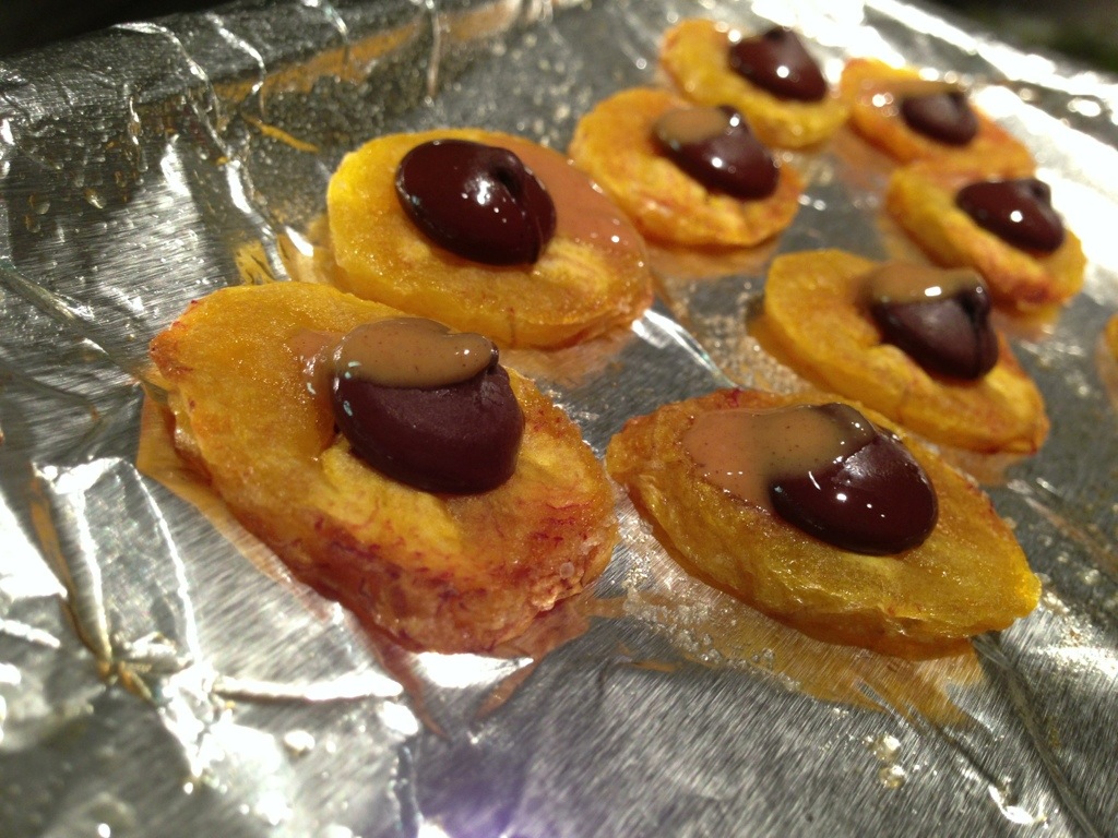 3. While still warm, place one chocolate chip on each plantain slice and smear a tiny bit of peanut butter to each one.