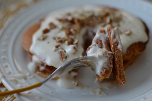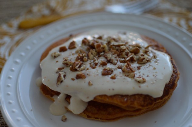 6. Serve pancakes topped with icing and chopped nuts.