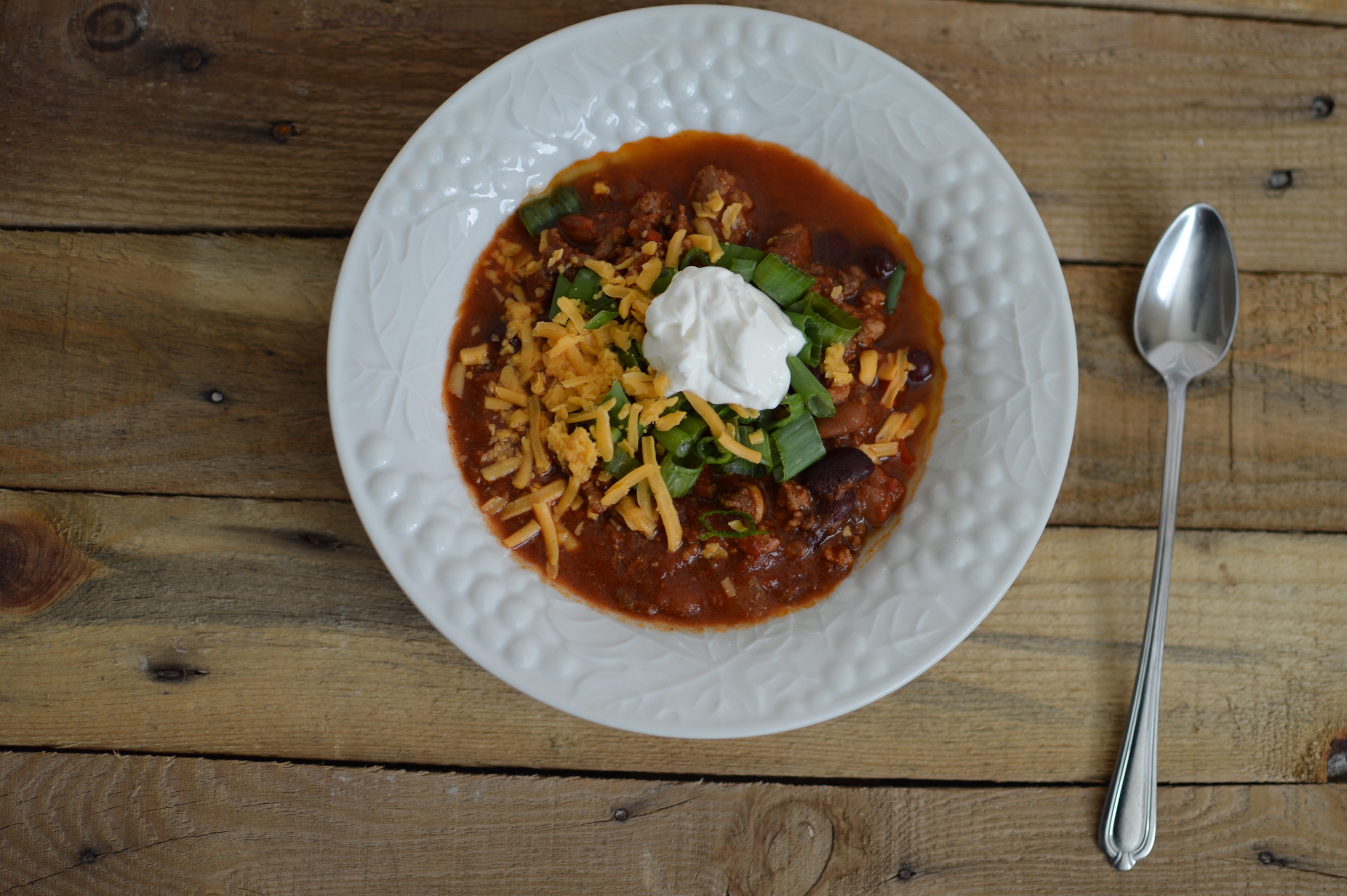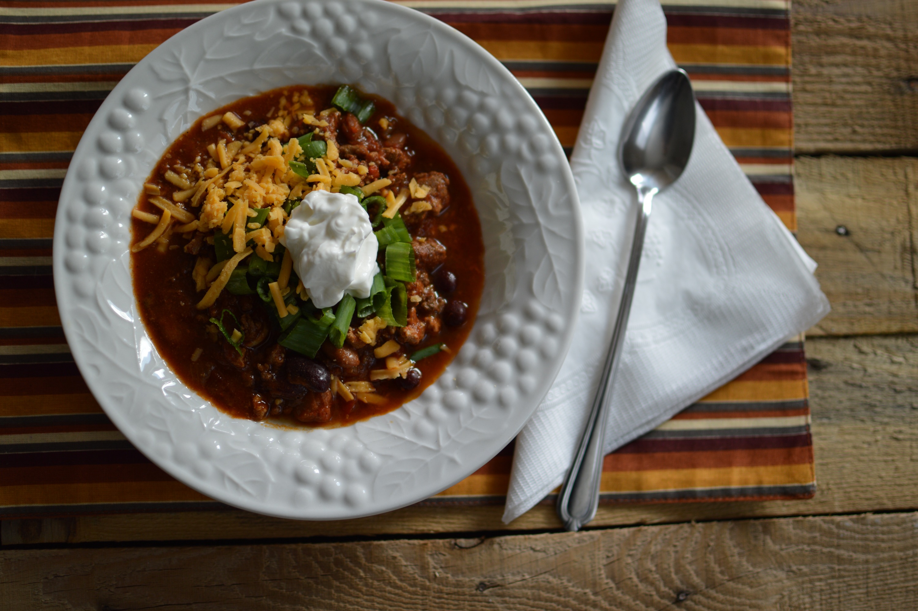Easy Crockpot Chili Recipe found here. The only changes I made to the chow.com recipe were to use a combination of red kidney beans and pinto beans and lean ground turkey instead of ground beef.