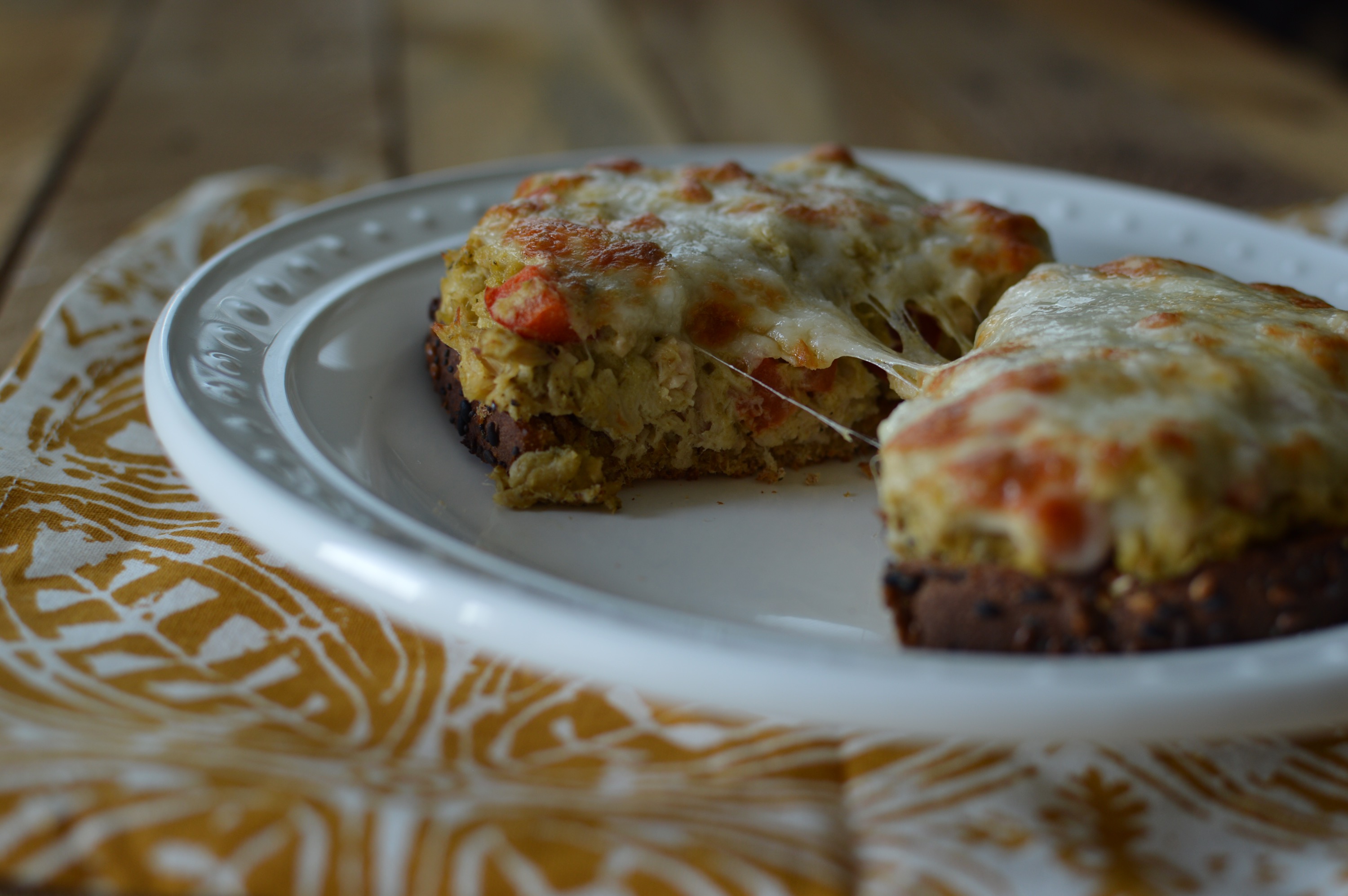 I made this recipe for the nights you don’t have time, energy, or ingredients to cook with. That was me every night this week. I got back from 10 days out of town last Sunday, and hadn’t had time to meal prep or grocery shop. I ended up buying a rotisserie chicken and salad mix Monday morning for lunches at work. I also picked up greek yogurt, almonds, and apples for snacking. I cooked something fast and easy every night this week- rotisserie chicken quesadillas and grilled vegetables, blueberry banana protein shakes, and these pesto tuna melts.